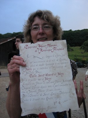 À la Ferme Ste-Anne, au pied de la Cité de Jeanne Mance, après un tir nourri d’arquebuses, le président Jean-Paul Pizelle lança la plaquette rassemblant les 72 pionniers et leurs 41 communes. Ce travail, illustré d’une photo de chaque lieu, est une des bases du futur volume Champagne-Ardenne-Alsace-Lorraine de la collection « Ces villes et villages de France, berceau de l’Amérique française ». Puis une série de chants du 17e, notamment amérindiens, retentirent, interprétés par un chœur du groupe Montéclair. Chaque représentant des Communes reçut un parchemin réalisé par une artiste calligraphe attestant la naissance des pionniers dans leurs lieux respectifs. Puis le groupe Dulcilmer exécuta une série de danses d’époque. Enfin, 400 ballons bleus et blancs s’élevèrent dans le ciel. Le message emporté par l’un d’eux fut retrouvé vers Nuremberg (Allemagne). Le repas champêtre animé par un orchestre permit d’attendre les feux de la St-Jean qui éclairèrent la soirée sous un ciel étoilé.